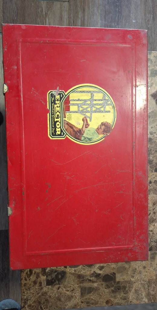 Complete vintage A.C. Gilbert No. 8½ All-Electric Erector Set in its original red metal carrying case. A remarkable collector's piece from the golden age of American construction toys. HIGHLIGHTS: • Model: No. 8½ All-Electric – "The World's Greatest Toy" • Manufacturer: The A.C. Gilbert Company, New Haven, Connecticut, U.S.A. • Era: Circa 1947 • Condition: Complete set with all components in original metal case WHAT'S INCLUDED: • Original red metal carrying case with iconic Erector logo and artwork • Electric motor (working) with reversing engine capability • Electro-Magnet • Original instruction manual with model building plans • Full set of steel girders, square girders with interlocking edges • Metal plates, base plates, and angle pieces in multiple colors (blue, yellow, red) • Wheels, pulleys, axles, and connecting hardware • Motor housing and miniature building components • All original nuts, bolts, and fasteners CASE ARTWORK: • Front: Classic "Erector – The World's Greatest Toy" medallion with boy building • Inside lid: "Builds Giant Ferris Wheel" illustration showing Giant Power Plant and Ferris Wheel models • Features the iconic A.C. Gilbert branding and New Haven, Connecticut origin CONDITION NOTES: • Case shows age-appropriate wear and surface scratches consistent with vintage use • All mechanical components present and functional • Original brass hinges and latches intact • Manual shows age wear but remains readable with all pages present A truly complete and desirable example of one of America's most iconic vintage toys. The No. 8½ was one of Gilbert's premium sets, capable of building the Giant Ferris Wheel and other ambitious models. Perfect for serious toy collectors, Americana enthusiasts, or vintage engineering toy displays.