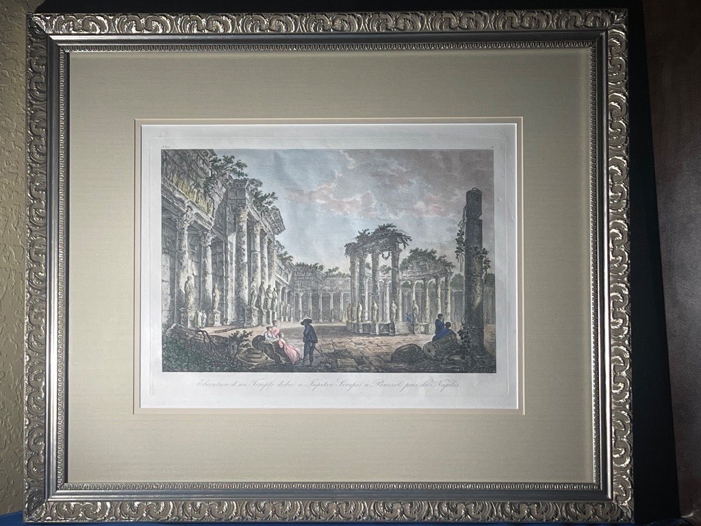 Authentic 18th-century hand-colored copperplate engraving of ancient ruins, numbered #211 — a companion piece to #498 from the same antique series. Original hand-applied color over expert copperplate line engraving. Custom framed with glass enclosure for preservation. Includes Certificate of Authenticity (COA) and full provenance documentation. A distinguished addition to any collection of antique European prints or Old Master works. Sourced in Woodstock, Georgia. Ideal for antique art galleries, estate collections, and serious print collectors seeking authenticated 18th-century works.
