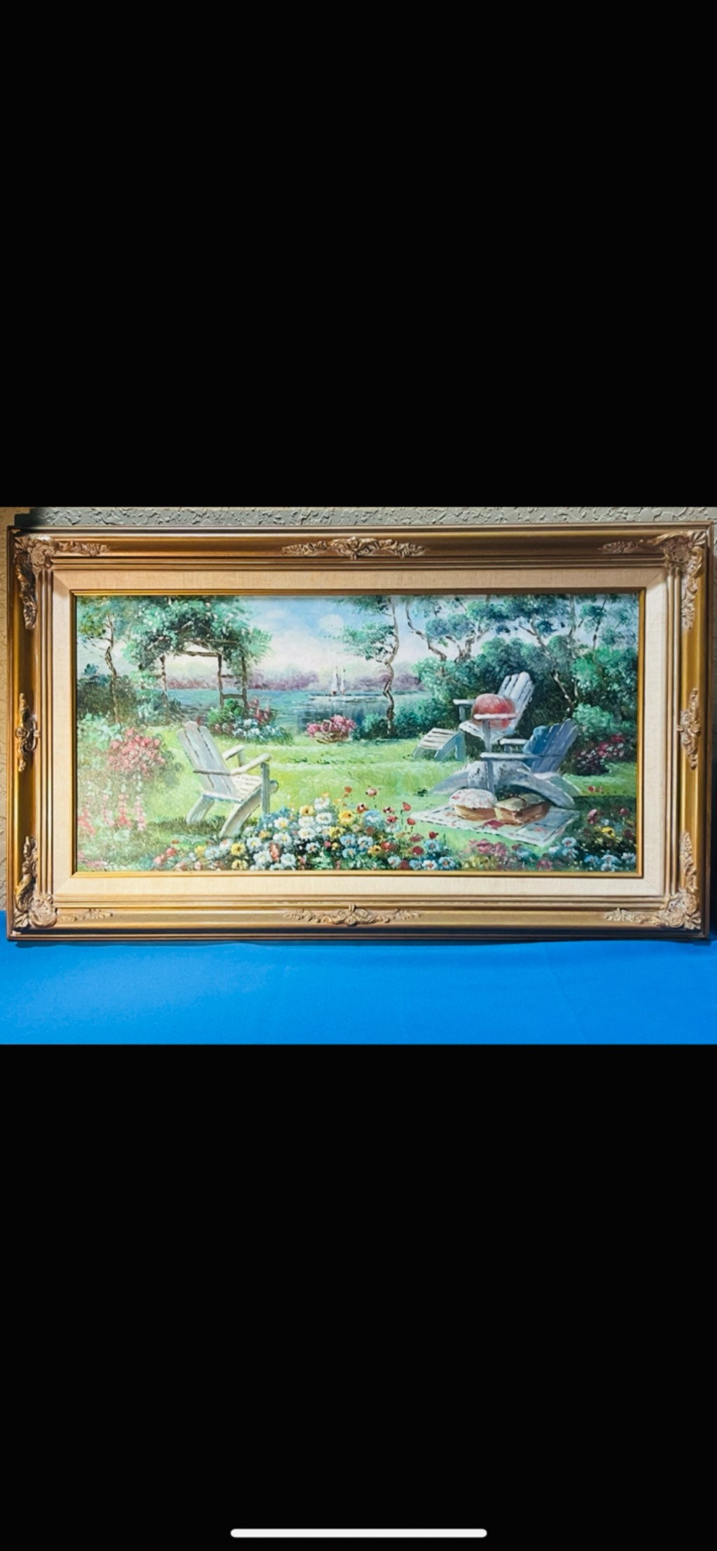Alvin Farr "Coastal Impressionist" 1992. Original mixed media on canvas depicting a vibrant tropical coastal scene with lush garden, flowing water features, and a serene bridge. Accompanied by Certificate of Authenticity (COA) and provenance documentation. Presented in an elegant custom gold frame. A stunning statement piece for collectors of impressionist landscape art.