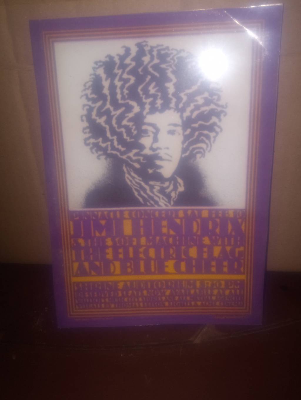 Jimi Hendrix 5x7 inch concert poster print featuring psychedelic purple and gold artwork. Features The Soft Machine, The Electric Flag, and Blue Cheer. A striking piece of rock and roll memorabilia for any music collector.