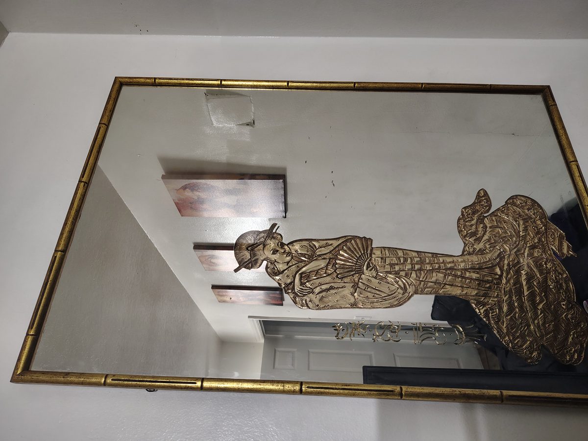 Elegant gold-framed antique mirror in excellent condition. Features ornate brass detailing with a classic vintage aesthetic.