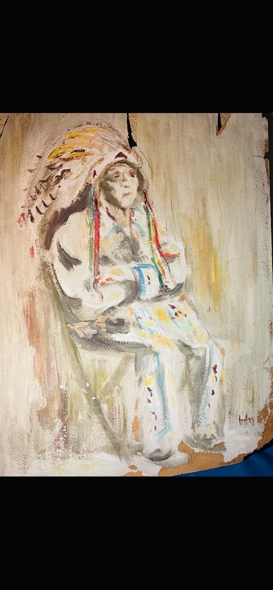 “Native American Chief” 1975, Pastel-Mixed Media Painting on Board, Provenance