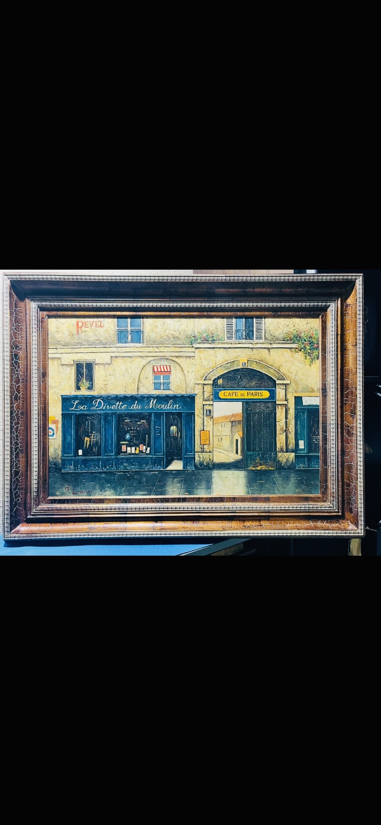Original oil on canvas depicting a charming Parisian café street scene featuring "La Divette du Moulin" and "Café de Paris." Heavy impasto technique with rich textures and warm tones. Artist signed. Presented in a custom 4-tiered ornate wood frame. Canvas: 35.5" x 24.5", Framed: 46.5" x 34.5". Excellent condition.