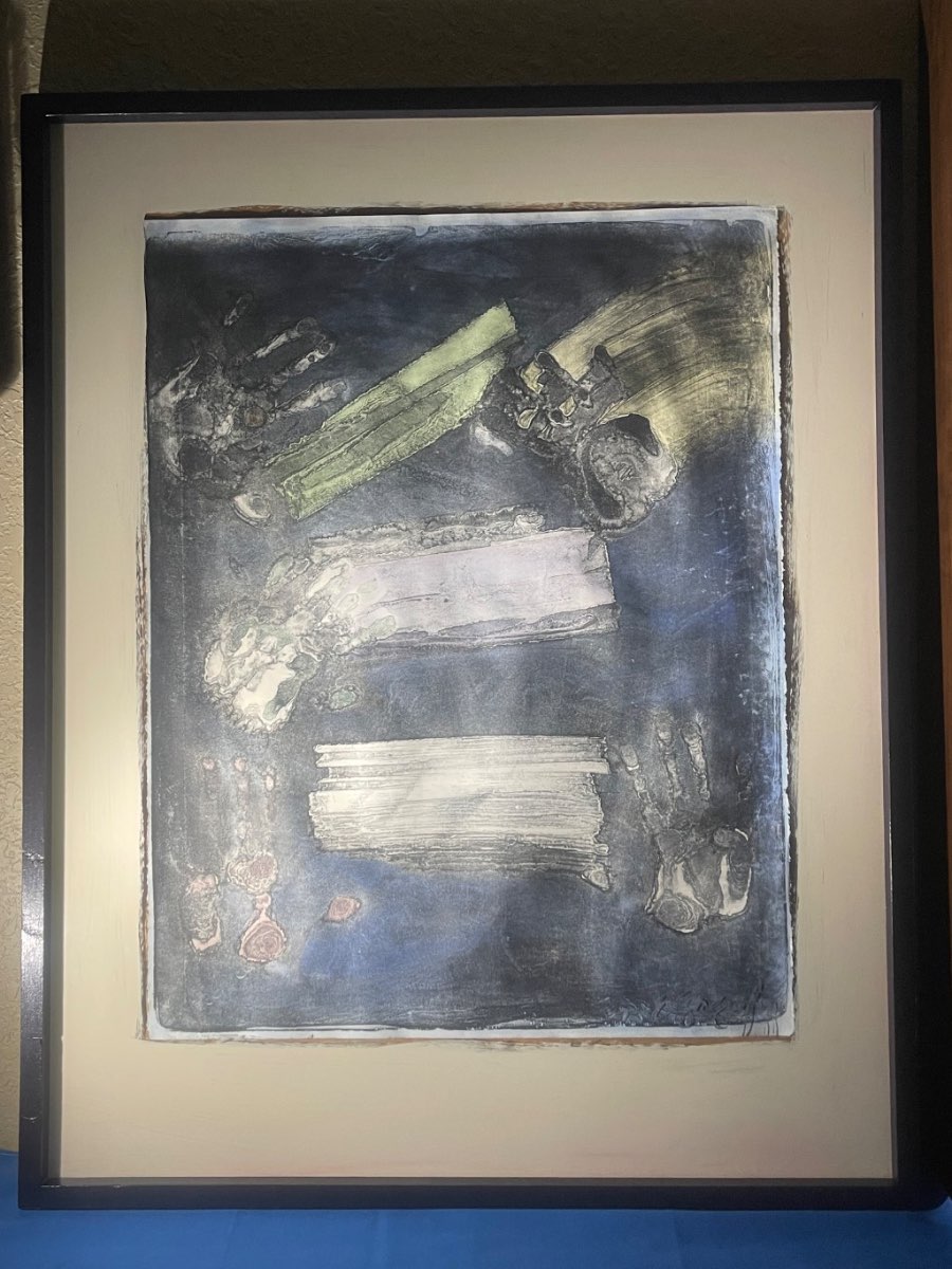 Signed Abstract Woodcut by Hideo Hagiwara – Original Mixed Media, Custom Framed