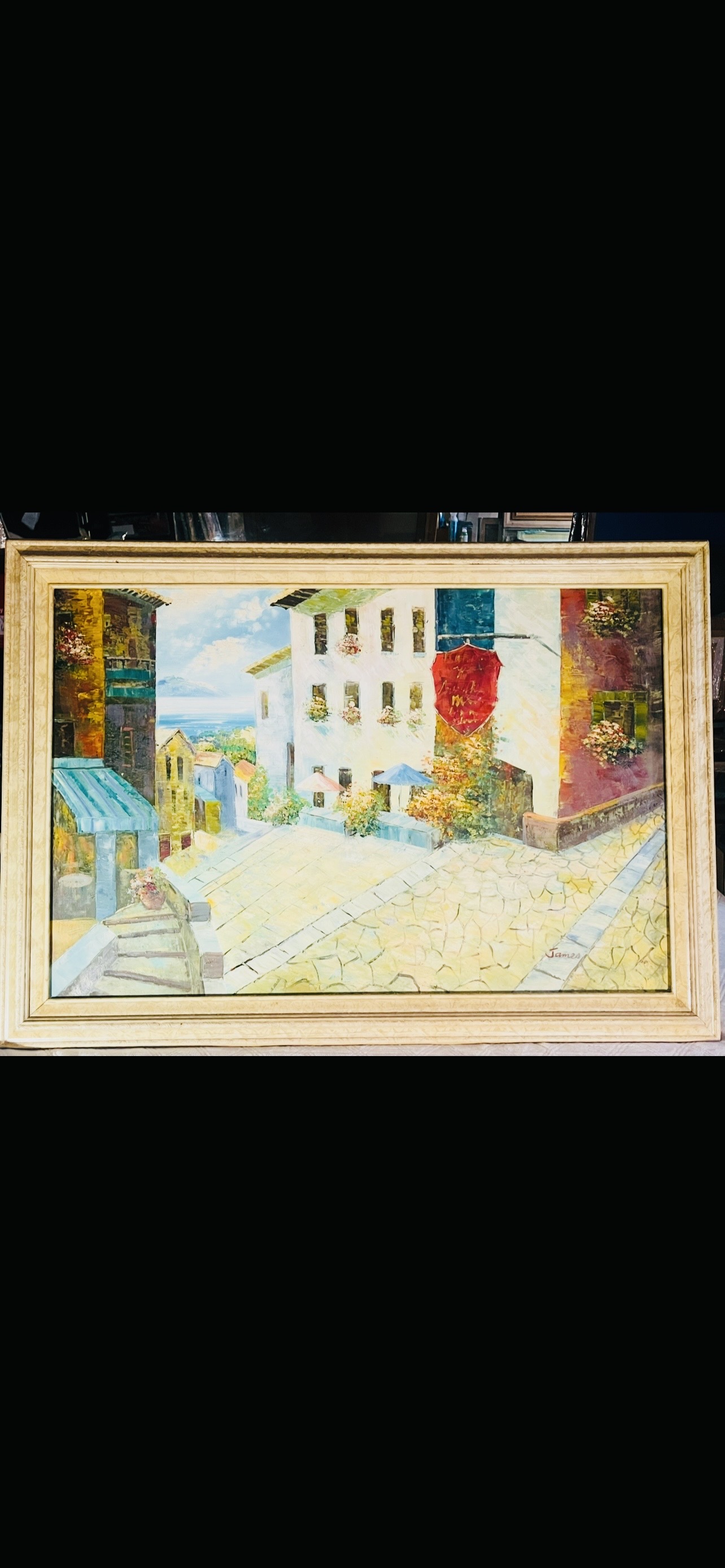 Gorgeous original oil and mixed media painting of a European coastal cityscape, hand-signed by artist James. This atmospheric work captures the shimmering light and architectural character of a Mediterranean or Northern European harbor town with impressionistic flair. Nicely framed and ready for display. Accompanied by Certificate of Authenticity (COA) and provenance documentation. A beautifully decorative and collectible work that would complement both traditional and contemporary interiors. Available in Woodstock, Georgia. Ideal for art collectors, interior designers, and admirers of European coastal scenes seeking a signed original at accessible price points.