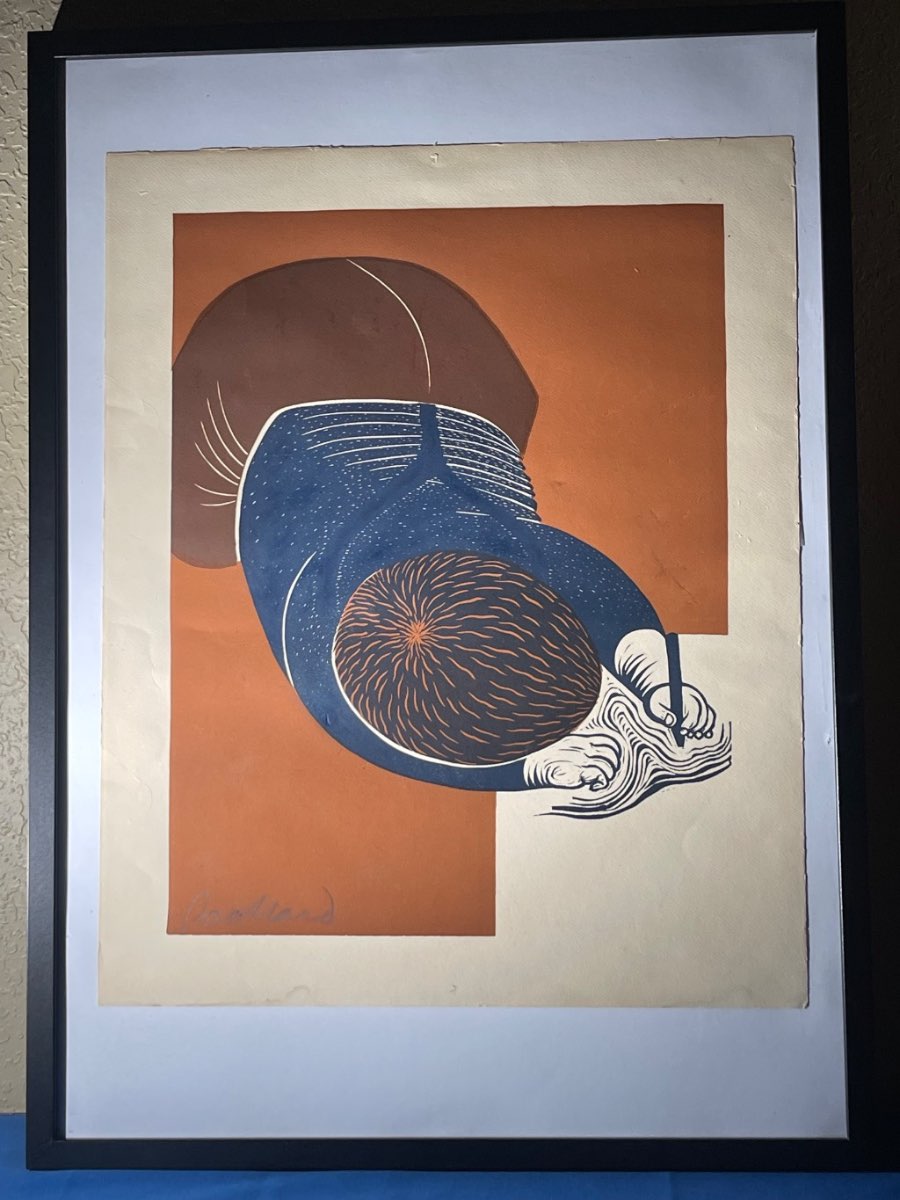 Original woodcut and mixed media artwork titled "Woman Drawing," hand-signed by acclaimed California artist Emma Lou Packard. Packard was a significant figure in 20th-century American printmaking and social realism, known for her bold, expressive compositions. This intimate figurative work showcases her mastery of the woodcut medium. Presented in a custom wood frame with glass. Includes Certificate of Authenticity (COA) and provenance. A rare opportunity to own a signed original by this historically important American artist. Available in Woodstock, Georgia. Sought after by collectors of American modernist and WPA-era prints.