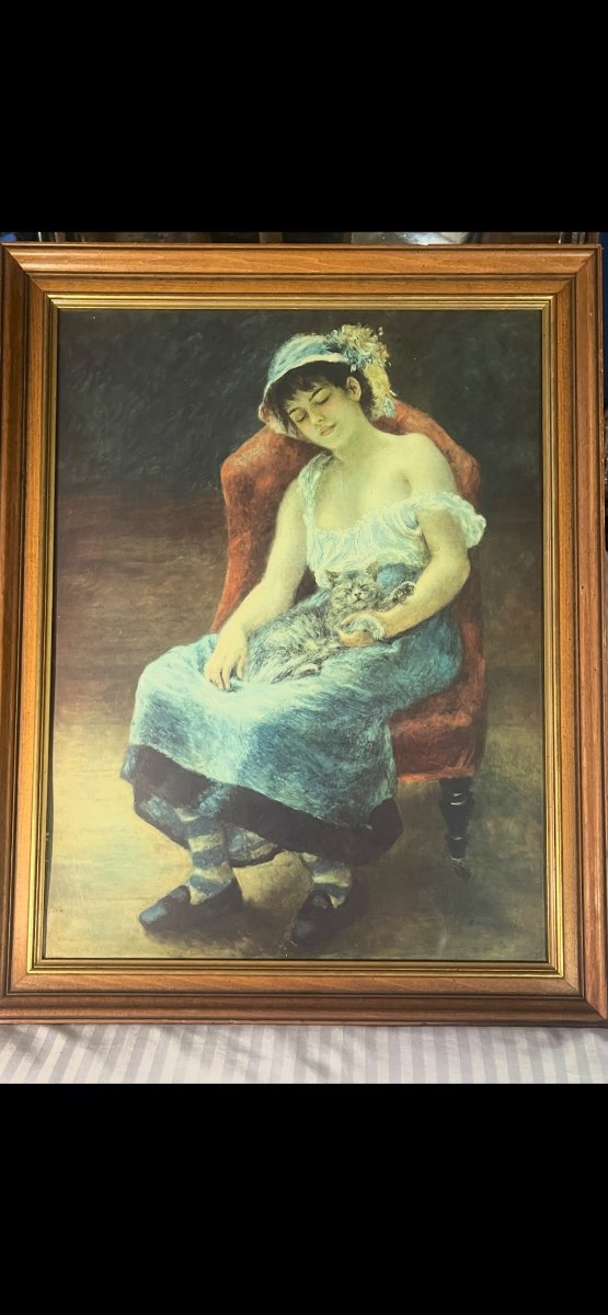 Vintage framed reproduction print in the style of Pierre-Auguste Renoir, depicting a seated young woman holding a cat. The composition reflects late 19th-century Impressionist influence with soft brush-style textures and a warm tonal palette. **Dimensions:** Framed: 30"H × 23.25"W × 3"D | Artwork: 26"H × 19.5"W **Provenance:** Smith Studio, 43 Park St., Adams, Massachusetts (original framing label present on reverse). **Condition:** Good vintage condition. Minor surface wear consistent with age. Frame intact and structurally sound. **Valuation:** Gallery Retail Value: $550 — David Culpepper Private Collection. A beautiful period piece with authentic vintage framing and documented provenance. Ideal for Impressionist décor collectors or period print enthusiasts.