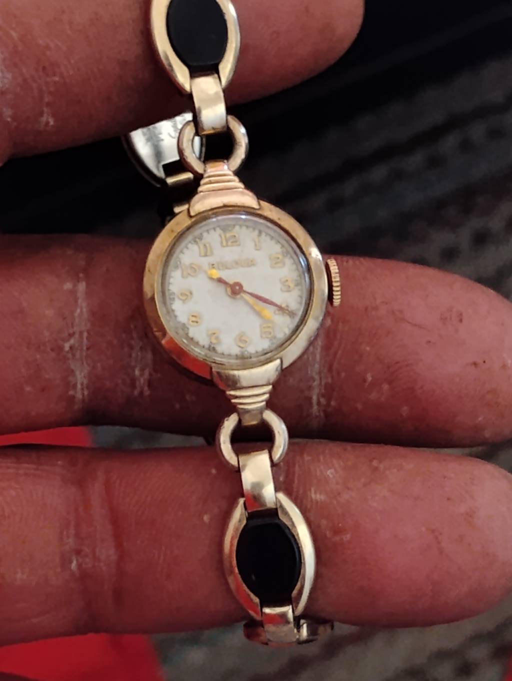 Vintage Bulova ladies wristwatch with white face, gold case, and distinctive black onyx accents on the bracelet. Has original serial number on back. A classic mid-century timepiece.