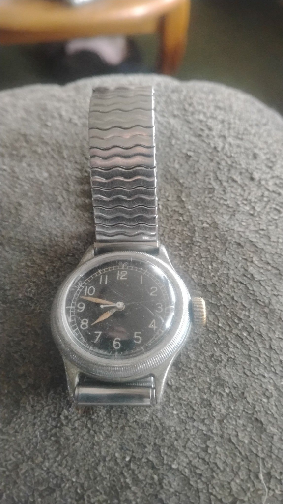 WWII Bulova Type A-11 military hack watch. U.S. Army AAF. All original markings intact. Caseback: SPEC NO. 94-27834-B, BULOVA WATCH CO., Part No. 10 AK CSH. Black dial, Arabic numerals, expansion bracelet.